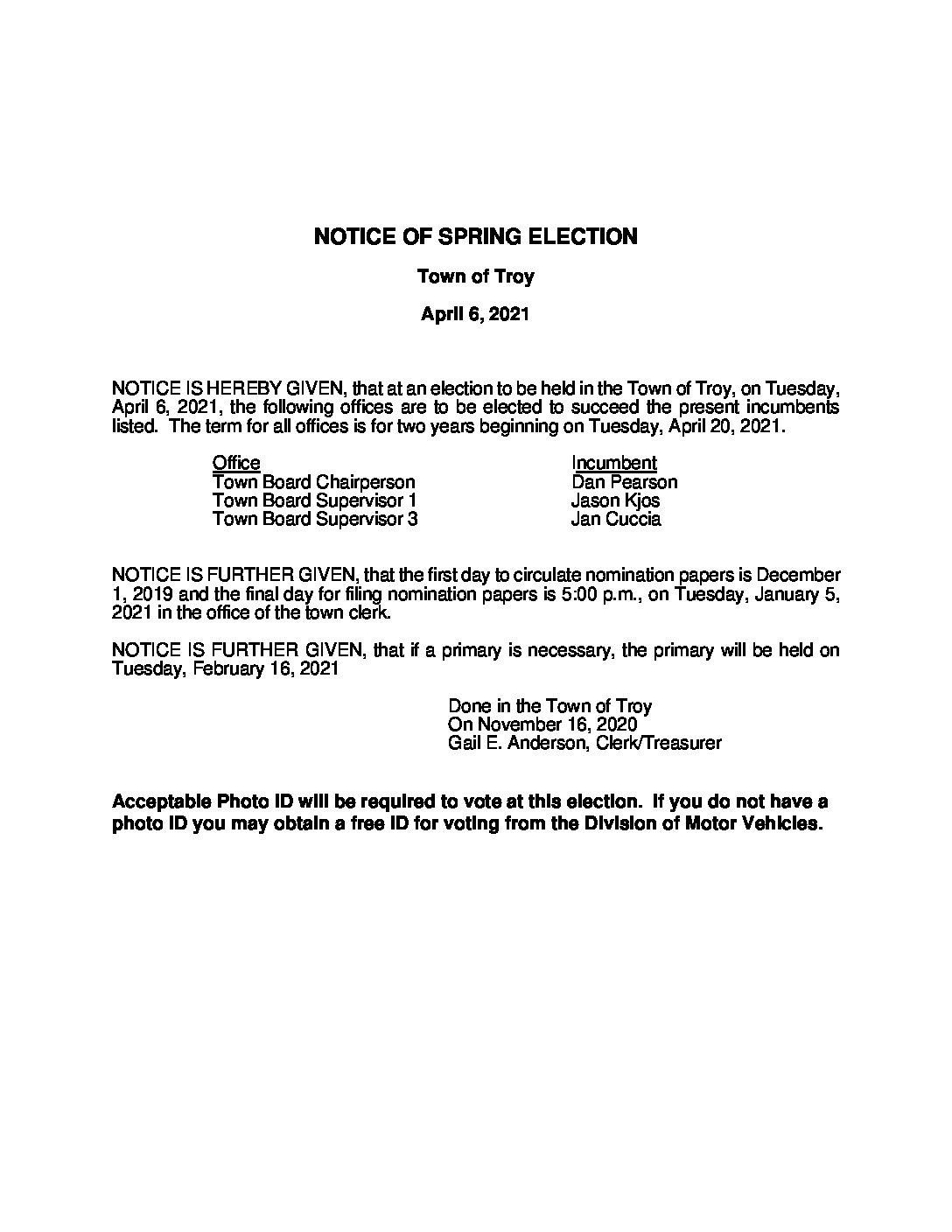 NOTICE OF SPRING ELECTION TOWN OF TROY APRIL 7, 2026 NOTICE IS HEREBY GIVEN that at an election to be… Read More